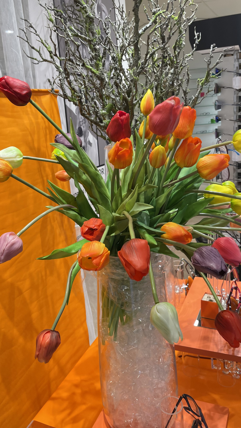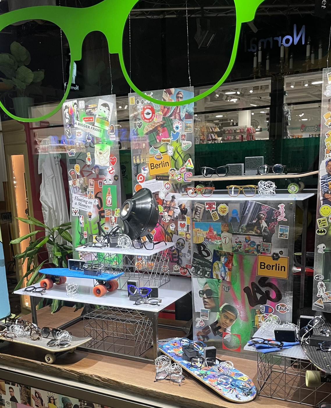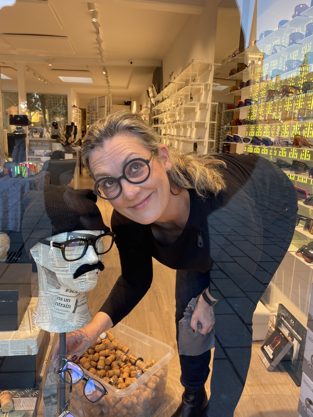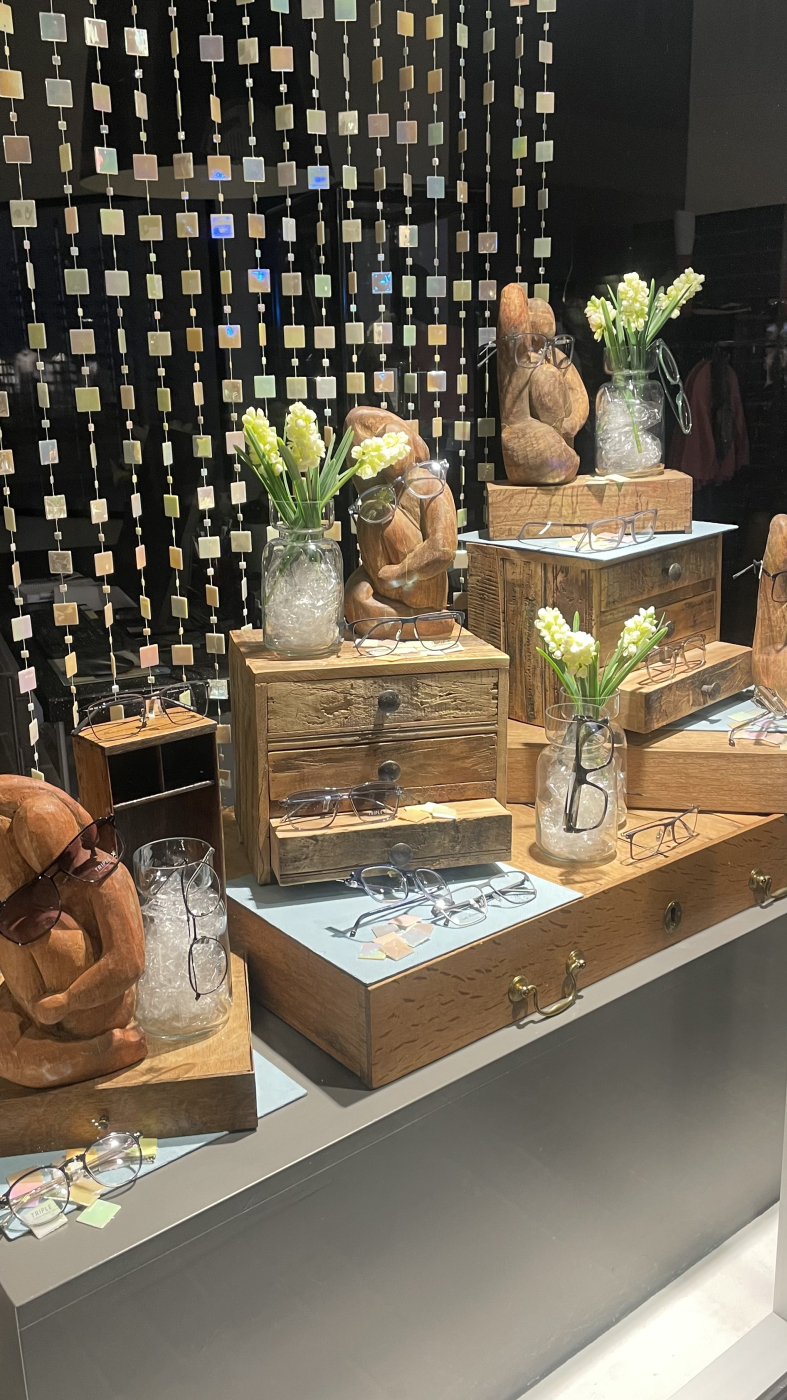Jeg samarbejder meget gerne med lokale kunstnere eller butikker, for at skabe spændende blikfang med et unikt snit. Hos Øjensynlig i Sorø inviterede jeg den lokale billedkunstner Malan Egholm (malanegholm.art) med i vinduet, for at skabe ekstra blikfang til de forholdsvis små brillestel, der ellers ikke fylder meget i et stort butiksvindue.